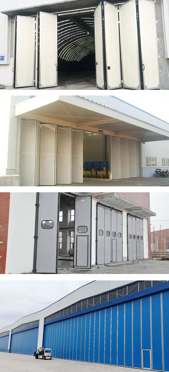 工業折疊門主要由門框、門扇、傳動部件、轉臂部件、傳動桿、定向裝置等組成。這種門型既可以安裝在室內也可以安裝在室外。每個折疊門有四個門,兩個側門和兩個中門。側門葉一側的門框通過鉸鏈與中門扇連接,側門葉另一側的門梃上下端分別設有上、下轉軸,分別與門洞兩側門框的上、下轉軸座連接。側梃會繞著側梃旋轉,帶動中間門扇旋轉90°,從而實現門扇的開啟和關閉。當門通電時,上轉軸端設有轉臂部分和傳動部分,門框上部中間設有傳動部分和開門部分。中間門扇上設有定向裝置。工業折疊開門器運行后,帶動各傳動部分的兩個齒輪轉動,與之嚙合的兩個齒條直線運動。齒條的另一端連接轉動臂,轉動臂循環運動,使側門框繞側梃轉動,門扇電動開啟。兩個中間門扇的中間縫設有安全保護裝置,關閉時遇到障礙物會回到全開狀態,安全可靠。門寬3000-4800毫米,高3000-4800毫米。共有26種規格,有電動和手動兩種。